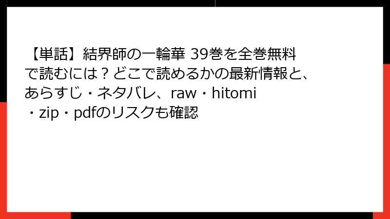 こんにちは、漫画好きのみなさん! 今日は、raw、hitomi、zip、pdf、漫画バンクなどの海賊版サイトで人気の漫画『結界師の一輪華』を読むことのリスクについて、詳しく解説していきたいと思います。このようなサイトは無料で最新巻をすぐに読める魅力がありますが、実はさまざまな危険が潜んでいます。法的問題からセキュリティの脅威、経済的な損失まで、ブログ記事形式で読み応えのある内容をお届けします。海賊版サイトの利用は避け、正規のルートをおすすめしますが、なぜ危険なのかをしっかり理解しましょう。以下、複数のセクションで深掘りします!