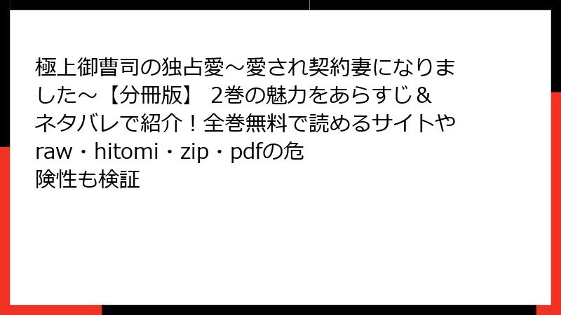 こんにちは、漫画愛好家の皆さん! ブログ管理人の私です。今日は、魅力的なロマンス漫画『極上御曹司の独占愛~愛され契約妻になりました~【分冊版】 2巻』のような人気作品を、rawやhitomi、zip、pdf、漫画バンクなどの海賊版サイトで読むことのリスクについて、深掘りしてお話ししたいと思います。この作品は、契約結婚から始まる甘いストーリーが話題ですが、そんな素敵な漫画を違法サイトで楽しむのは、実は一大ブーメランになる可能性大。法的問題からセキュリティの脅威、健康被害まで、さまざまな危険が潜んでいます。以下では、ブログ形式でリスクを分類して詳しく解説します。安全に漫画を楽しむための参考にしてくださいね!