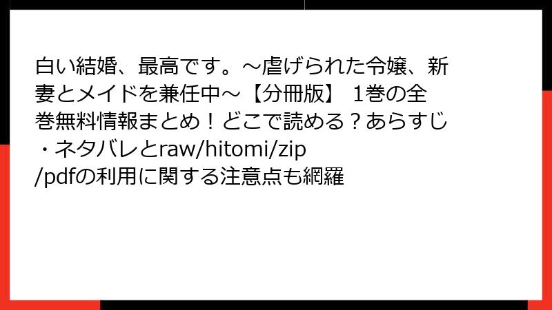 こんにちは、漫画ファンの皆さん! 今回は、2024年にマンガボックスで連載開始された人気コミカライズ作品『白い結婚、最高です。〜虐げられた令嬢、新妻とメイドを兼任中〜【分冊版】1巻』のレビュー、口コミ、評判を詳しくお届けします。原作は火野村志紀先生の小説で、石蕗こはな先生の可愛らしい作画が話題の本作。契約結婚やシンデレラストーリー、復讐要素が詰まったロマンス漫画として、読者の心を掴んでいます。この記事では、SNSや電子書籍ストア、掲示板などの情報をもとに、1巻の評判を複数の視点から分析。良い点、批判点、読者層の傾向を