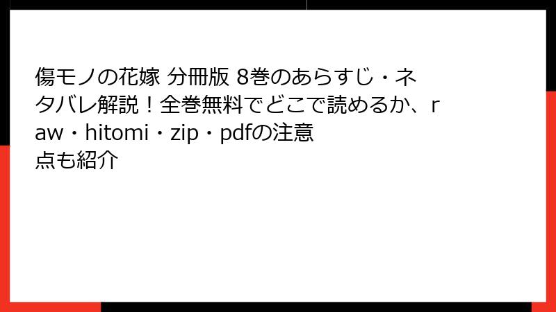 『傷モノの花嫁 分冊版 8巻』をraw、hitomi、zip、pdf、漫画バンクなどの海賊版サイトで読むことは、法的、倫理的、技術的、品質的なリスクを伴います。違法行為による処罰、作者や業界へのダメージ、デバイスや個人情報の危険、粗悪な読書体験――これらのリスクを考えると、正規版を選ぶのが賢明です。菜々緒と夜行の感動的な物語を、最高のクオリティで、安心して楽しみたいですよね。