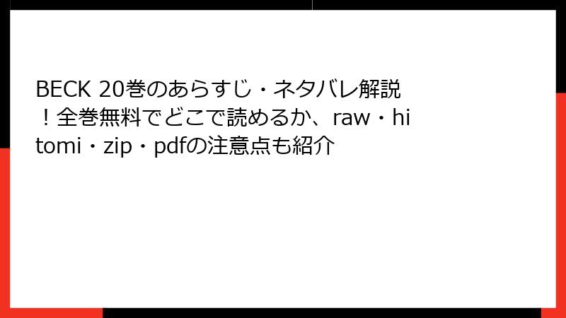 ハロルド作石の『BECK』20巻は、バンドの危機と再起を巡る激動の一冊。音楽漫画の金字塔として知られる本作のこの巻では、主要キャラクターたちの葛藤、ライバルとの対決、そして感動的な再結集が描かれます。以下では、20巻の詳細なネタバレを、物語の鍵となるシーンやキャラクターの動きを中心に、ブログ記事形式で解説します。未読の方はご注意を! これから、物語の核心に迫る展開をじっくり紐解いていきましょう。