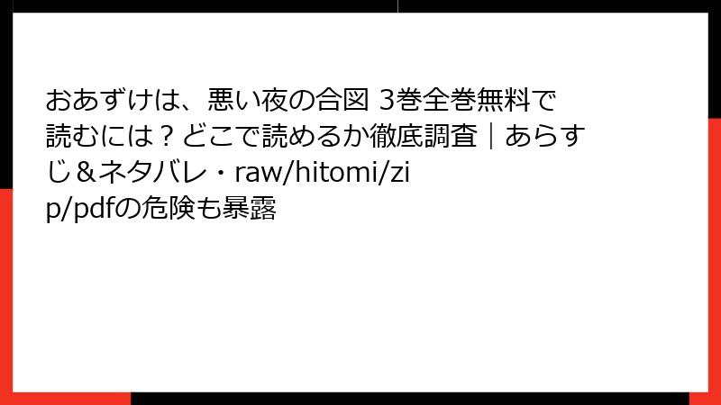 こんにちは、漫画ファンの皆さん! 人気のBL漫画『おあずけは、悪い夜の合図』を心から楽しみたいと思っている方の中には、raw、hitomi、zip、pdf、漫画バンクなどの海賊版サイトで無料で読もうと考える方もいるかもしれません。しかし、これらのサイトを利用することは、重大なリスクを伴います。この記事では、海賊版サイトで漫画を読むことの危険性を、法的、倫理的、技術的な観点から詳しく解説します。単なる「無料で読める」という誘惑の裏に潜む問題を理解し、好きな漫画を正規の方法で楽しむための知識を深めましょう。以下、読み応えのある内容で、具体的なリスクを紐解いていきます。