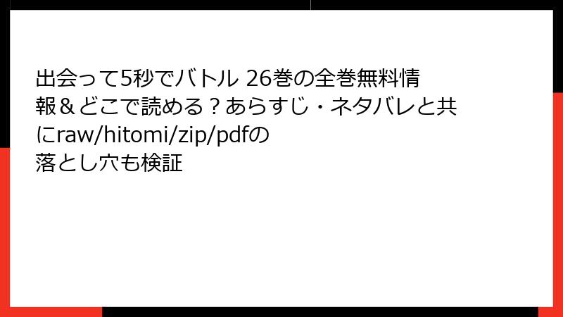 raw、hitomi、zip、pdf、漫画バンクなどの海賊版サイトは、法的・セキュリティ・プライバシー・経済的なリスクが満載。無料の代償は大きすぎます。代わりに、正規の電子書籍サービスを利用しましょう。初回割引や無料エピソードが充実しており、作者を応援しながら安心して読めます。『出会って5秒でバトル』26巻も、正規ルートで楽しむのがベスト。リスクを避け、クリーンなエンタメライフを!