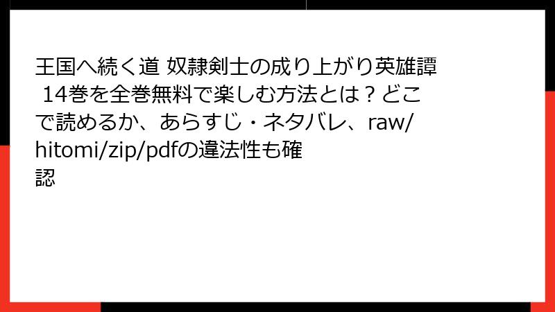 こんにちは、漫画ファン必見のセキュリティブログへようこそ! 今日のテーマは、誰もが一度は気になってしまう『王国へ続く道 奴隷剣士の成り上がり英雄譚』のような人気コミックを、rawやhitomi、zip、pdf、漫画バンクなどの海賊版サイトで読むことのリスクです。無料で最新巻をサクッと楽しめるなんて夢のようですが、現実はそんなに甘くありません。法的トラブルからデバイス破壊、個人情報流出まで、深刻な危険が待ち受けています。この記事では、そんなリスクを徹底的に掘り下げて解説。まだ海賊版に手を出していない皆さん、ぜひ最後まで読んで正しい楽しみ方を身につけましょう! ネタバレなしで、純粋に安全第一でお届けします。
