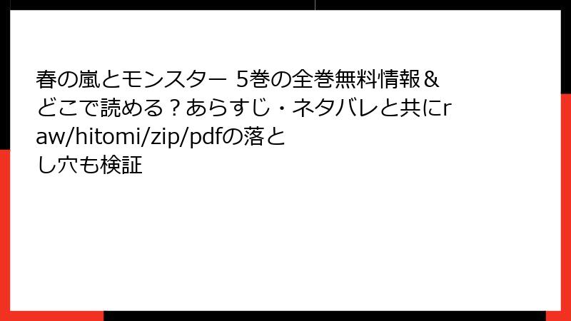こんにちは、漫画ファンの皆さん! 今日は、皆さんが気になっているであろう「春の嵐とモンスター」などの人気漫画を、raw、hitomi、zip、pdf、漫画バンクなどの海賊版サイトで読むことのリスクについて、詳しくお話しします。これらのサイトは一見、無料で最新巻や全巻を楽しめそうに見えますが、実際には深刻な法的・セキュリティ・経済的な問題を引き起こす可能性が高いんです。ブログ記事形式で、複数のセクションに分けて読み応えのある内容にまとめました。海賊版サイトの利用は絶対に避け、正規の電子書籍サービスをおすすめします。それでは、さっそく本題に入りましょう!