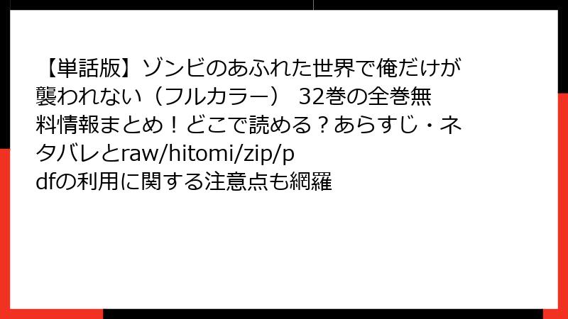 「ゾンビのあふれた世界で俺だけが襲われない」を全巻無料で読めるサービスは存在しません。一部の話数は無料キャンペーンで読めますが、最新話や全巻を読むには購入が必要です。漫画バンクやrawなどの違法サイトは、著作権侵害やマルウェア感染のリスクがあり、絶対に利用しないでください。