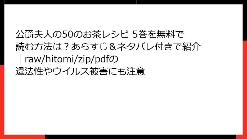 おすすめは、正規の電子書籍サービス。無料試し読みやセールが多く、安全です。例えば、漫画アプリでポイントを貯めて『公爵夫人の50のお茶レシピ』を合法的に楽しめます。リスクを避け、心置きなく漫画の世界に浸りましょう。皆さんの体験談や質問、コメントでシェアしてくださいね!