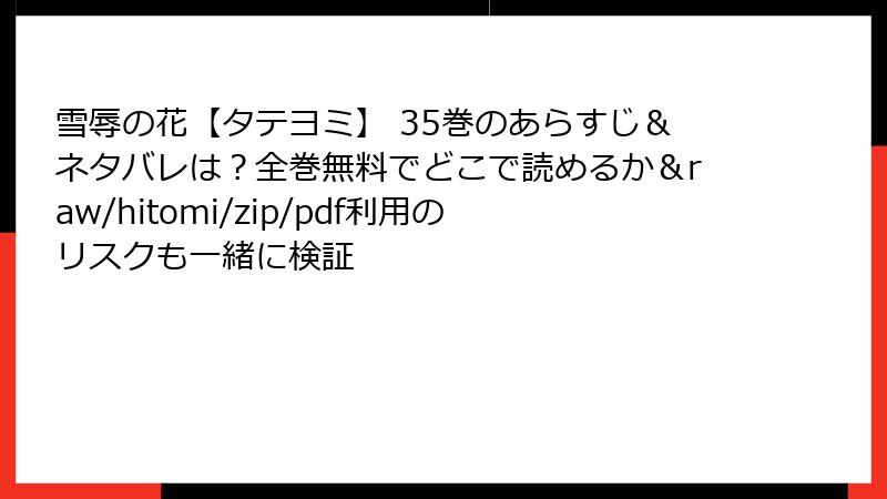 こんにちは、漫画ファン必見のブログ管理人です! snob先生の人気BL作品『雪辱の花【タテヨミ】』のような魅力的なストーリーを、raw、hitomi、zip、pdf、漫画バンクなどの海賊版サイトで無料で読みたい気持ち、わかりますよ。でも、待ってください! 2025年現在、海賊版サイトの取り締まりはますます厳しくなり、利用者の被害報告も急増中。一見お得に見えるこれらのサイトですが、法的・セキュリティ・経済的なリスクが山積みです。この記事では、そんな危険性を複数の角度から詳しく解説。読み応え満載で、なぜ正規ルートを選ぶべきかを紐解いていきます。『雪辱の花【タテヨミ】』の美しいイラストと心理描写を、安全に楽しむための参考にどうぞ!