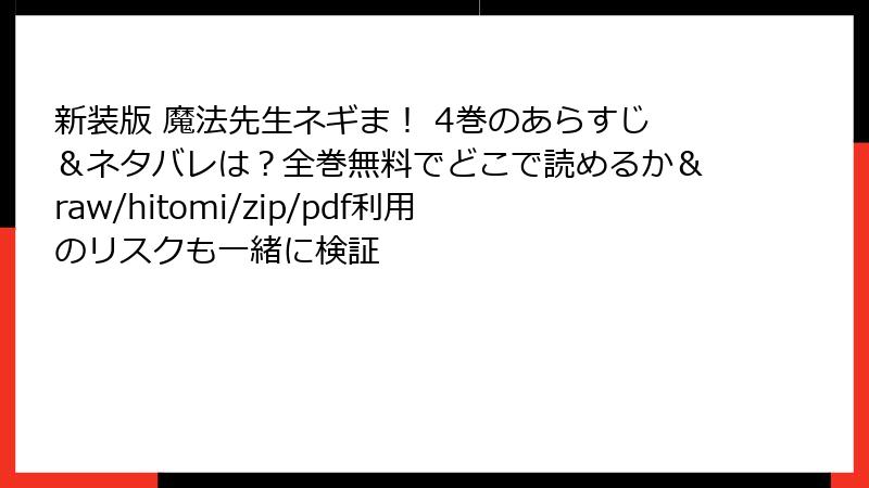 こんにちは、マンガ好きの皆さん! 今日のトピックは、ちょっとシリアスですが、『新装版 魔法先生ネギま!』のような名作を、rawやhitomi、zip、pdf、漫画バンクなどの海賊版サイトで読むことのリスクについて。無料で手に入る魅力に負けそうになる気持ち、わかりますよ。でも、実際には法的・セキュリティ・倫理的な落とし穴が満載なんです。2025年現在、取り締まりが強化され、被害報告も増えています。この記事では、そんなリスクを詳しく掘り下げてみましょう。まだ読んでいない方は、合法サービスをおすすめします!
