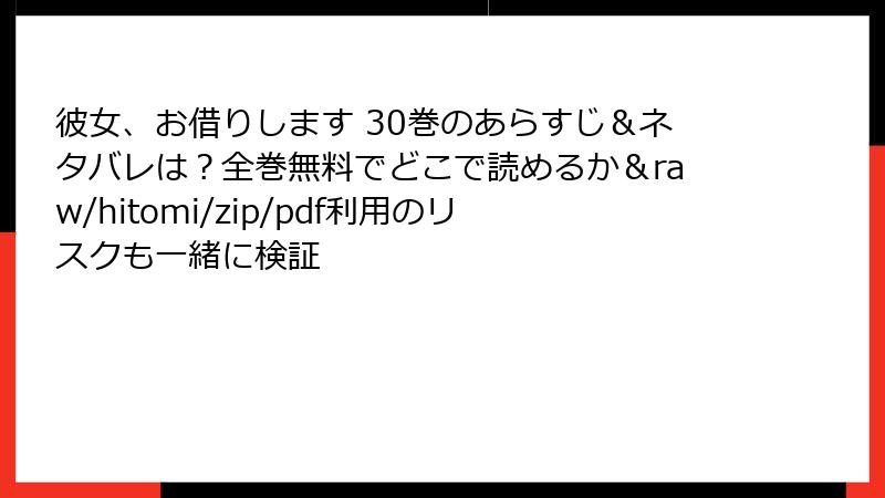 こんにちは、漫画ファン必見のセキュリティ意識向上ブログです! 人気ラブコメ『彼女、お借りします』の30巻が話題沸騰中ですが、rawやhitomi、zip、pdf、漫画バンクなどの海賊版サイトで無料で読もうとするのは、超危険信号! 今回は、そんな違法サイトのリスクを徹底的に掘り下げて解説します。法的トラブルから個人情報漏洩、デバイス破壊まで、知らないと後悔するかも…? 複数のハ3タグでカテゴリ分けし、箇条書きやテーブルで読みやすくまとめました。ネタバレなしで安心して読んで、正規ルートで楽しむマインドを養いましょう!