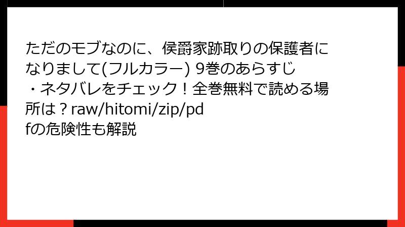 『ただのモブなのに、侯爵家跡取りの保護者になりまして(フルカラー)』は、魅力的なストーリーと美しいフルカラーイラストで人気のマンガですが、raw、hitomi、zip、pdf、漫画バンクなどの海賊版サイトで読むことは重大なリスクを伴います。これらのサイトは違法にコンテンツを配布しており、利用することで法的、倫理的、技術的な問題に直面する可能性があります。この記事では、海賊版サイトを利用するリスクを詳細に解説し、なぜ正規の方法でマンガを楽しむべきかを説明します。
