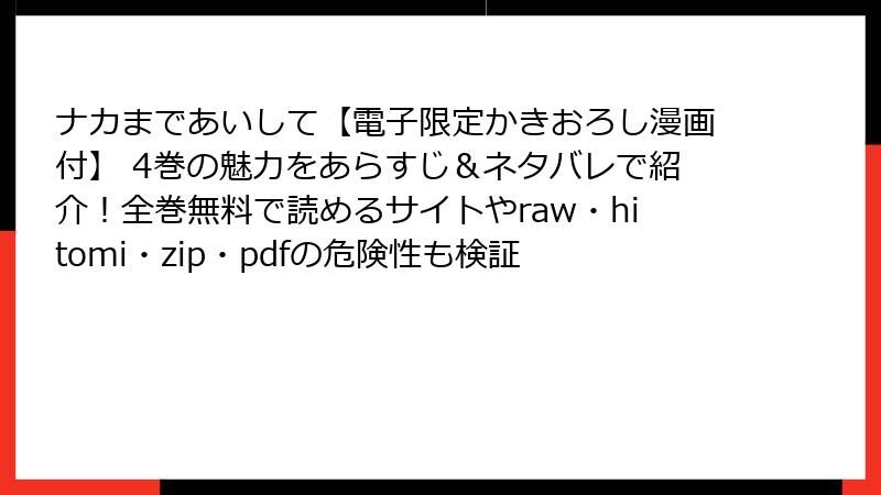いかがでしたか? 『ナカまであいして』4巻は、甘い誘惑と心の成長が詰まった傑作。次巻が待ち遠しいですよね。皆さんの感想もコメントで聞かせてください♪ また次回のレビューでお会いしましょう!