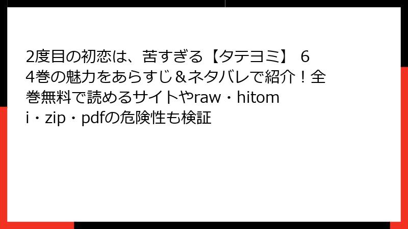 こんにちは、漫画愛好家の皆さん! ブロガーのあかりです。今回は、Zhuyi/jjwxc、zero、Guoxiaoによる人気タテヨミマンガ『2度目の初恋は、苦すぎる【タテヨミ】』を、raw、hitomi、zip、pdf、漫画バンクなどの海賊版サイトで読むことのリスクについて、詳しく解説します。この作品は、切ない恋愛模様と魅力的なキャラで多くのファンを魅了していますが、無料で読める誘惑に駆られて海賊版サイトを利用するのは絶対にNG! なぜなら、そこには法的、倫理的、そして技術的な重大なリスクが潜んでいるからです。この記事では、ブログ形式でその危険性を掘り下げ、漫画を安全に楽しむための意識を高めましょう。それでは、さっそく見ていきます!