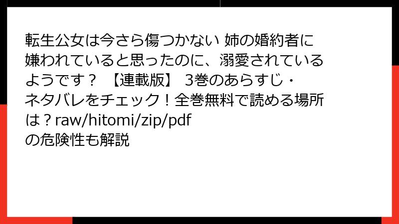 『転生公女は今さら傷つかない 姉の婚約者に嫌われていると思ったのに、溺愛されているようです? 【連載版】』は、魅力的なストーリーとキャラクターで多くの読者を惹きつける人気の漫画です。しかし、この作品をraw、hitomi、zip、pdf、漫画バンクなどの海賊版サイトで読むことは、多くのリスクを伴います。以下では、海賊版サイトを利用することの危険性を、法的、倫理的、技術的な観点から詳しく解説します。ブログ形式で、