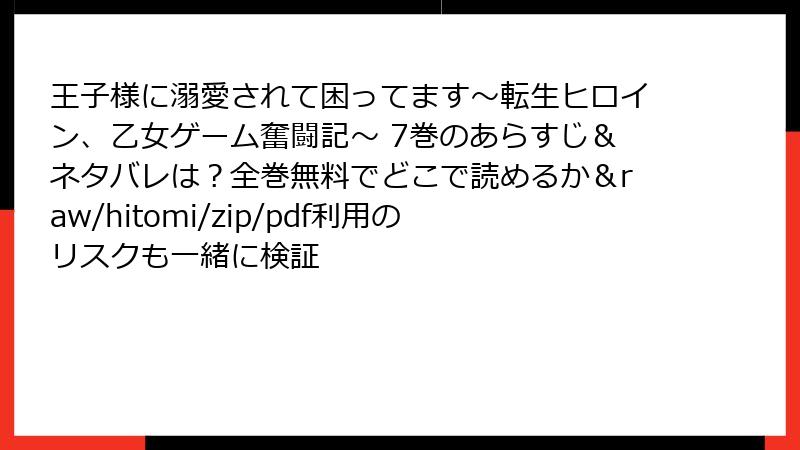 『王子様に溺愛されて困ってます~転生ヒロイン、乙女ゲーム奮闘記~』をraw、hitomi、zip、pdf、漫画バンクなどの海賊版サイトで読むことは、法的な罰則、セキュリティリスク、倫理的な問題、品質の低下といった多くの危険を伴います。これらのリスクは、無料で読める一時的なメリットを大きく上回るものです。好きな作品を長く楽しむためにも、正規の購入ルートを選び、作者や業界を応援することが大切です。シルヴィアとアーサーの物語を安心して堪能し、漫画文化を支える一歩を踏み出しましょう!