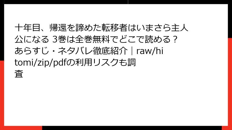 皆さん、こんにちは! 漫画好きのブロガー、セーフリーディングです。今日は、魅力あふれる作品『十年目、帰還を諦めた転移者はいまさら主人公になる』のような人気コミックを、raw、hitomi、zip、pdf、漫画バンクなどの海賊版サイトで読むことのリスクについて、深掘りしてお話しします。無料で最新巻にアクセスできるのは魅力的ですが、2025年現在、これらのサイトは法的・セキュリティ・経済的な罠だらけ。利用者の被害事例が急増しており、軽い気持ちで訪れると取り返しのつかない事態に陥る可能性大です。この記事では、複数の側面からリスクを詳しく解説し、なぜ正規ルートを選ぶべきかを読み応えのある内容でお届けします。まだ海賊版に手を出していない方は、ぜひ参考に!