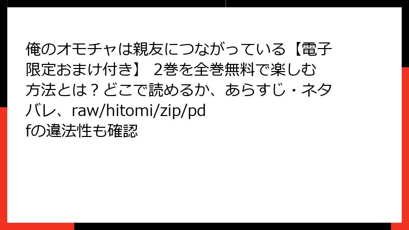 『俺のオモチャは親友につながっている』を海賊版で読むリスクは、法的・セキュリティ・経済・倫理の4大脅威。2025年のデジタル環境では、正規サービスが圧倒的に優位です。被害額6000億円の闇に手を染めず、作者を応援するファンであり続けるのが本物の愛。皆さんの安全な読書体験を祈っています。コメントで代替サービスのオススメも待ってます♪