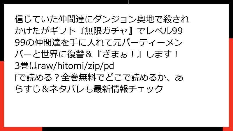 こんにちは、復讐系異世界漫画の虜の皆さん! 今回は『信じていた仲間達にダンジョン奥地で殺されかけたがギフト『無限ガチャ』でレベル9999の仲間達を手に入れて元パーティーメンバーと世界に復讐&『ざまぁ!』します!』のコミカライズ版第3巻のネタバレを、余すことなくお届けします。この巻は、主人公ライトの復讐劇が本格始動し、裏切り者たちへの「ざまぁ」展開が炸裂するターニングポイント。物語の核心に迫る展開やキャラクターの活躍を、詳細に掘り下げます。ネタバレ全開なので、未読の方はご注意を! さあ、ライトの逆襲の幕開けを一緒に見ていきましょう。