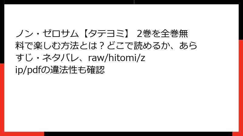 raw/hitomi/zip/pdf/漫画バンクなどの海賊版サイトは、法的罰則、マルウェア感染、経済損失、倫理的ジレンマの塊。2025年の今、取り締まりが厳しくなり、被害報告も増加中です。「ノン・ゼロサム【タテヨミ】」の複雑な絆を描くストーリーを、安心して堪能するためにも、正規サービスを選びましょう。皆さんの安全な漫画ライフを応援しています! ご質問があれば、コメントお待ちしてます。
