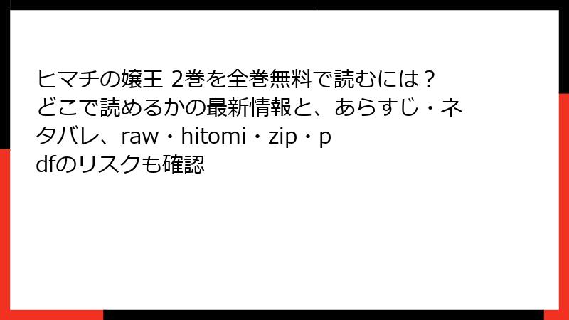 「ヒマチの嬢王」は、茅原クレセによる人気漫画で、鳥取県米子市を舞台に元歌舞伎町No.1キャバ嬢のアヤネの活躍を描いた作品です。しかし、このような人気漫画を、raw、hitomi、zip、pdf、漫画バンクなどの海賊版サイトで読むことは、重大なリスクを伴います。海賊版サイトは無料で漫画を提供しているように見えますが、法的、倫理的、技術的な問題が潜んでいます。この記事では、「ヒマチの嬢王」を海賊版サイトで読むことの具体的なリスクを詳しく解説します。