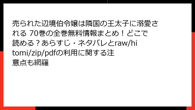 こんにちは、マンガファンの皆さん! 『売られた辺境伯令嬢は隣国の王太子に溺愛される』は、ファンタジーロマンスの傑作として多くの読者を魅了しています。しかし、raw、hitomi、zip、pdf、漫画バンクなどの海賊版サイトでこの作品を読むことは、重大なリスクを伴います。無料で読める誘惑に駆られる気持ちは分かりますが、違法サイトの利用は法的、倫理的、技術的な問題を引き起こす可能性があります。この記事では、海賊版サイトを利用することの危険性を詳しく解説し、なぜ正規の方法でマンガを楽しむべきかをブログ形式で掘り下げます。読み応えのある内容で、具体的なリスクを