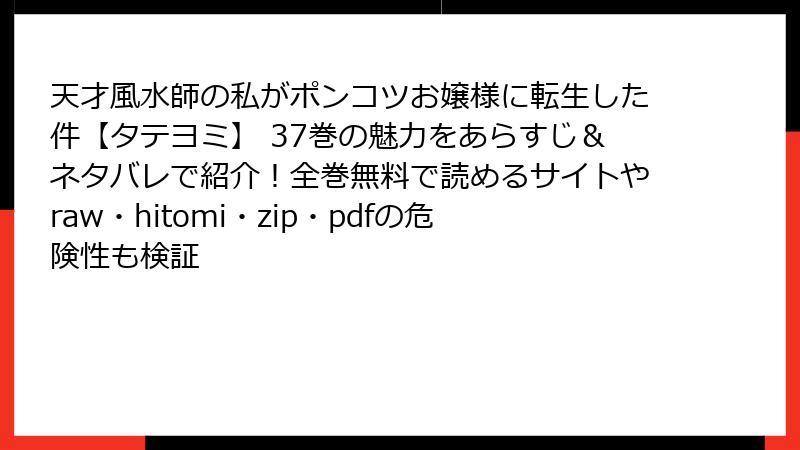 こんにちは、マンガ好きのブロガーです! 今日も魅力あふれる作品にスポットを当ててお届けします。今回は、異世界転生の王道に風水というユニークな要素を融合させた人気作、『天才風水師の私がポンコツお嬢様に転生した件【タテヨミ】』の37巻について詳しく掘り下げていきます。このシリーズは、現代の天才風水師が顔に傷を負ったポンコツお嬢様に転生し、前世の知識で家族の陰謀や社会のしがらみを風水術で切り抜けていく痛快ストーリー。37巻では、物語が新たなクライマックスを迎え、主人公の成長と周囲の変化がより鮮やかに描かれています。ネタバレを交えつつ、読み応え満点のあらすじを、複数の角度から解説していきますよ!