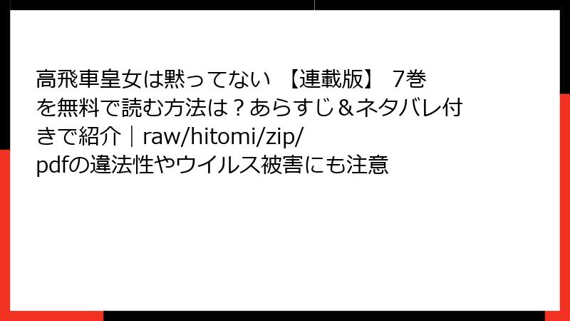 『高飛車皇女は黙ってない 【連載版】 7巻』をraw、hitomi、zip、pdf、漫画バンクなどの海賊版サイトで読むことは、法的、倫理的、技術的なリスクを伴います。著作権侵害による処罰、クリエイターや業界への悪影響、ウイルスや個人情報漏洩の危険、劣悪な読書体験、そして社会的な評判の低下など、デメリットは計り知れません。クローディアの正義感やベリルの忠誠心を心から楽しむためにも、正規のプラットフォームや書店での購入を選び、作品と作者を応援しましょう。安全で高品質な読書体験を通じて、『高飛車皇女は黙ってない』の世界を存分に堪能してください!