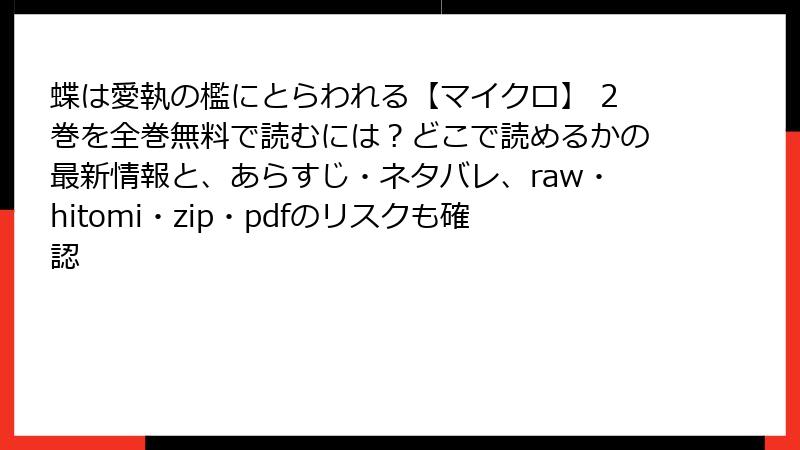 こんにちは、漫画愛好家の皆さん! ブログ「セーフマンガライフ」へようこそ。今日は、七海月先生の『蝶は愛執の檻にとらわれる【マイクロ】』のような魅力的な作品を、raw、hitomi、zip、pdf、漫画バンクなどの海賊版サイトで読むことのリスクについて、深掘りしてお届けします。無料で最新巻にアクセスできるのは魅力的ですが、2025年現在、これらのサイトは法的・セキュリティ・倫理的な地雷原。利用者の被害事例が急増しており、軽い気持ちで訪れると取り返しのつかない事態に陥る可能性大です。この記事では、複数の視点からリスクを読み応え満載で解説。なぜ正規ルートを選ぶべきか、具体例を交えてお伝えします。未読のリスクを今すぐチェック!