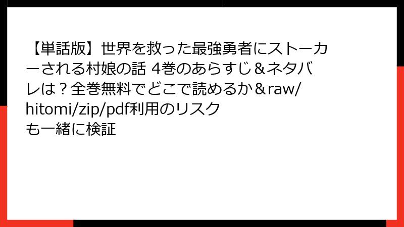 『世界を救った最強勇者にストーカーされる村娘の話』は、ヤンデレとファンタジーが融合した魅力的な漫画ですが、raw、hitomi、zip、pdf、漫画バンクなどの海賊版サイトで読むことは多くのリスクを伴います。この記事では、海賊版サイトを利用することの危険性を詳細に解説し、なぜ合法的な手段で読むべきかをブログ形式で紹介します。法律、倫理、セキュリティの観点から、具体的なリスクを掘り下げます。