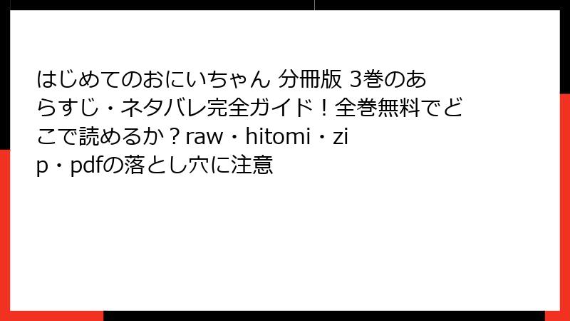 「はじめてのおにいちゃん 分冊版 3巻」をraw、hitomi、zip、pdf、漫画バンクなどの海賊版サイトで読むことは、法的リスク、倫理的問題、セキュリティの危険、品質の低さ、アクセスの不安定さなど、さまざまなデメリットを伴います。無料で読める魅力は一見魅力的ですが、ウイルス感染や個人情報漏洩、さらには好きな作品の未来を奪うリスクは計り知れません。ファンとして、こころと蒼の物語を心から楽しむためには、コミックシーモアやリマコミ+などの正規プラットフォームを選び、安心して高品質な読書体験を楽しみましょう。作者を応援し、漫画業界の未来を守るためにも、正規ルートでの購入が最善の選択です!