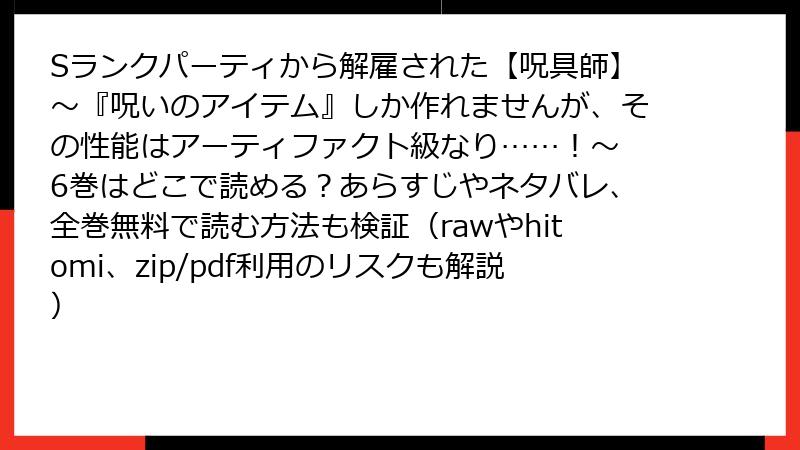 こんにちは、漫画ファンのみなさん! 『Sランクパーティから解雇された【呪具師】~『呪いのアイテム』しか作れませんが、その性能はアーティファクト級なり……!~』は、累計160万部を突破した大人気ファンタジー漫画です。ゲイルの逆襲劇に夢中になる読者が多い一方、raw、hitomi、zip、pdf、漫画バンクなどの海賊版サイトで無料で読もうとする人もいるかもしれません。しかし、これらのサイトを利用することは重大なリスクを伴います。この記事では、海賊版サイトで漫画を読むことの危険性を、法的・倫理的・技術的な観点から詳しく解説します。単行本や正規プラットフォームで楽しむ大切さを、ブログ形式でじっくりお伝えしますので、ぜひ最後まで読んでください!
