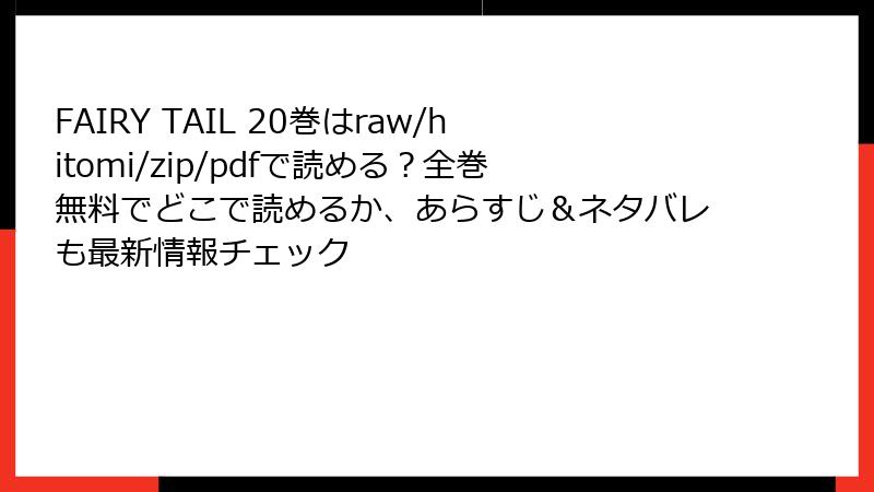 こんにちは、漫画好きの皆さん! 真島ヒロ先生の名作『FAIRY TAIL』のような熱いファンタジー作品を、raw、hitomi、zip、pdf、漫画バンクなどの海賊版サイトで無料で読みたいと思う気持ちはわかります。でも、ちょっと待ってください。そんな「タダ乗り」の誘惑の裏側には、想像以上のリスクが潜んでいます。この記事では、海賊版サイトを利用する具体的な危険性を、法的・セキュリティ・経済・倫理の観点から詳しく解説します。『FAIRY TAIL』の20巻を例に挙げながら、読み応えのある内容でお届け。安全に楽しむためのヒントも最後に! ネタバレなしで進めますので、安心してどうぞ。