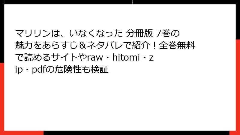 こんにちは、漫画ファン必見のセキュリティ意識向上ブロガーです! 今日は、葉月めぐみ先生の『マリリンは、いなくなった』のような魅力的な作品を、raw、hitomi、zip、pdf、漫画バンクなどの海賊版サイトで読むことのリスクについて、深掘りしてお伝えします。無料で最新巻にアクセスできるのは魅力的ですが、2025年現在、これらのサイトは法的・セキュリティ・倫理的な地雷原。利用者の被害事例が急増中です。ブログ記事風に、複数のセクションで詳しく解説し、なぜ正規ルートを選ぶべきかを読み応え満載でお届けします。海賊版に手を出したことがある方も、これを読んで二度と近づかないでくださいね!