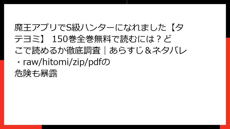 こんにちは、ウェブトゥーン愛好家のブロガーです! ダンジョンとハンターの現代ファンタジー『魔王アプリでS級ハンターになれました【タテヨミ】』は、底辺F級少年がチートアプリでS級ハンターに成り上がる爽快ストーリーが魅力の人気作。2025年9月27日現在、150巻を超える長編連載で、フルカラーのタテヨミ形式がスマホ読みにぴったりです。この記事では、コミックシーモア、ブックライブ、まんが王国、ebookjapan、Renta!、めちゃコミック、ピッコマ、LINEマンガなどの主要サービスでの配信状況を詳しく解説。無料試し読みの巻数やお得ポイントもまとめました。各サービスを