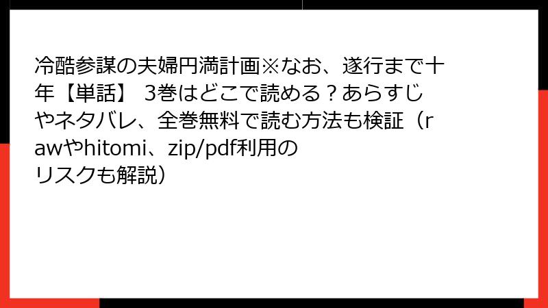 『冷酷参謀の夫婦円満計画※なお、遂行まで十年【単話】』をraw、hitomi、zip、pdf、漫画バンクなどの海賊版サイトで読むことは、法的、倫理的、技術的、経済的なリスクを伴います。これらのサイトは一見無料に見えますが、クリエイターや業界への損害、デバイスのセキュリティリスク、個人情報の漏洩など、大きな代償を払う可能性があります。代わりに、公式プラットフォームや図書館を利用することで、安全かつ合法的に漫画を楽しめ、作者や出版社を支えることができます。漫画業界の持続可能な発展のためにも、ぜひ正規の方法でこの素晴らしい作品を楽しみましょう!