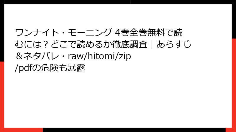 こんにちは、漫画愛好家の皆さん! 今日の記事では、奥山ケニチ先生の人気作『ワンナイト・モーニング』のような魅力的な漫画を、raw、hitomi、zip、pdf、漫画バンクなどの海賊版サイトで読むことのリスクについて、深掘りしていきたいと思います。無料で最新巻をサクッと読める魅力に惹かれる気持ちはわかりますが、2025年現在、これらのサイトは法的・セキュリティ・倫理的な落とし穴だらけ。単なる「便利な裏技」ではなく、デバイスや個人情報、さらには心の平穏を脅かす存在です。このブログでは、複数の視点からリスクを詳しく解説し、安全な代替手段も提案。読み応えのある内容で、皆さんの漫画ライフを守るお手伝いをします!