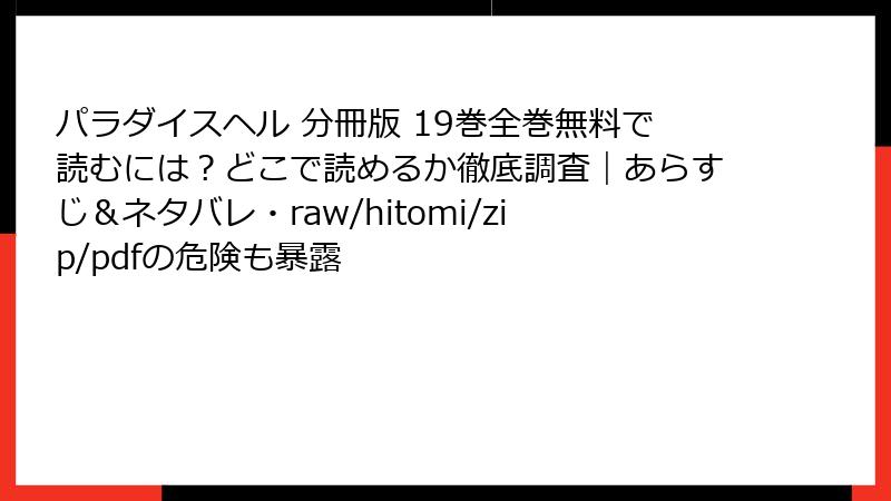 みなさん、こんにちは! 漫画好きの皆さんなら、ついつい無料で読める海賊版サイトに手を出したくなる気持ち、わかります。でも、待ってください! 今日のブログでは、冬坂あゆる先生の『パラダイスヘル 分冊版』のような魅力的な作品を、raw、hitomi、zip、pdf、漫画バンクなどの海賊版サイトで読むことのリスクを、詳しく掘り下げてお話しします。これらのサイトは一見お得に見えますが、法的・セキュリティ・経済的な落とし穴が満載。未読の皆さんはネタバレなしで正規ルートをおすすめしますが、今回はリスク特化でお届け! 複数の