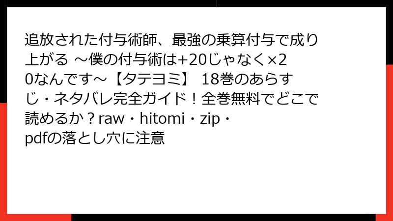 『追放された付与術師、最強の乗算付与で成り上がる ~僕の付与術は+20じゃなく×20なんです~【タテヨミ】』は、異世界ファンタジーの金字塔として、爽快な成り上がりストーリーとユニークな「乗算付与」設定で多くのファンを魅了しています。18巻では、禁断の遺跡を舞台に新たな展開が繰り広げられ、読者の間で話題沸騰! この記事では、18巻のレビュー・口コミ・評判をブログ形式で詳しく掘り下げます。単一の