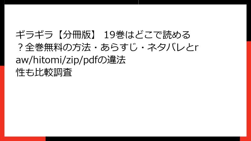 raw/hitomi/zip/pdf/漫画バンクなどの海賊版サイトは、法的罰金、ウイルス感染、倫理崩壊の三重苦。『ギラギラ19巻』の公平のように、信念を持って正規ルートを選びましょう! 被害を防ぎ、業界を盛り上げるのが真のファン。皆さんの体験談やおすすめ合法サイト、コメントでシェアしてください。次回はネタバレレビューでお会いしましょう!