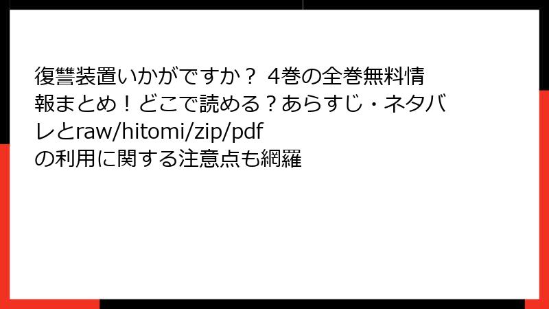 こんにちは、漫画を愛するブロガーです! 芳文社のダークサスペンス漫画『復讐装置いかがですか?』は、烏丸茜の復讐代行と衝撃の装置が話題の作品。こんな面白い漫画を、つい「無料で読みたい!」と思う気持ち、わかります。でも、raw、hitomi、zip、pdf、漫画バンクなどの海賊版サイトで読むのは危険がいっぱい! 今回は、これらのサイトを利用するリスクを、法律、セキュリティ、倫理の観点から徹底解説します。ブログ形式で、ネタバレなしで読み応えのある内容をお届け。海賊版の誘惑に負ける前に、ぜひ知っておいてください!