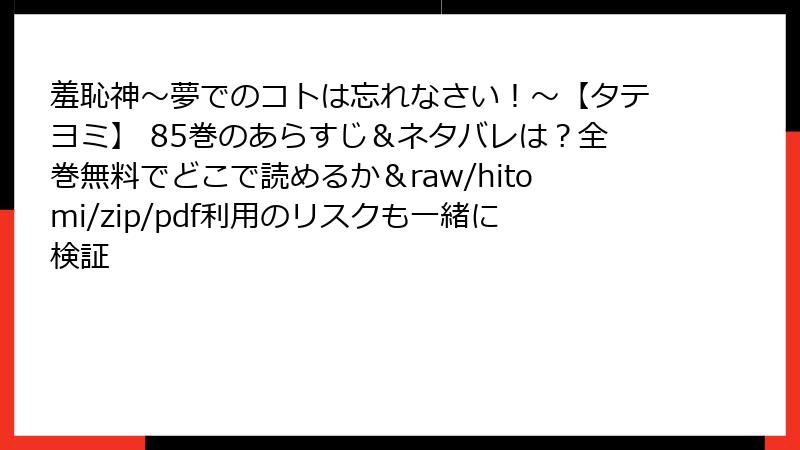 こんにちは、漫画ファンの皆さん! 今日のブログでは、ついつい手を出したくなる海賊版サイト(raw、hitomi、zip、pdf、漫画バンクなど)で『羞恥神~夢でのコトは忘れなさい!~』のような人気漫画を読むことのリスクについて、徹底的に掘り下げてお話しします。無料で最新話が読めるのは魅力的ですが、その裏側には深刻な危険が潜んでいます。法的トラブルから個人情報漏洩、デバイス破壊まで、さまざまな被害が報告されているんです。今回は、複数の視点から詳しく解説し、なぜ正規ルートを選ぶべきかを考えていきましょう。未読の皆さんは、まずはリスクを理解してから行動を!