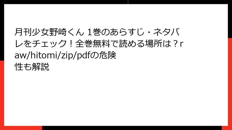 こんにちは、漫画愛好家のブロガーです! 人気の学園コメディ『月刊少女野崎くん』1巻のあらすじやネタバレを振り返ってきた私ですが、今回はちょっとシリアスなトピック。raw、hitomi、zip、pdf、漫画バンクなどの海賊版サイトでこれらの作品を読むことのリスクを、徹底的に掘り下げます。無料で手軽に読める魅力に惹かれる気持ちはわかりますが、その裏側には法的・セキュリティ・倫理的な落とし穴が満載。サイバーセキュリティの専門家や政府の報告、ユーザー体験談から得た情報を基に、詳細に解説します。未読の皆さんも、まずは正規ルートで楽しむことをおすすめ! 読み進めながら、自分のデバイスと財布を守るヒントも見つけてくださいね。