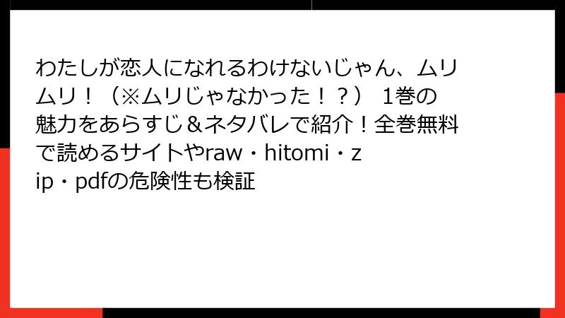 こんにちは、マンガ大好きブロガーのあかりです! 今回は、話題のガールズラブコメ『わたしが恋人になれるわけないじゃん、ムリムリ!(※ムリじゃなかった!?)』を、raw、hitomi、zip、pdf、漫画バンクなどの海賊版サイトで読むことの危険性について、ガッツリ解説します。この作品は、原作・みかみてれんさん、作画・むっしゅさん、キャラ原案・竹嶋えくさんのタッグによる青春と恋の傑作ですが、無料で読めるからと海賊版サイトに手を出すのは絶対NG! なぜダメなのか、法的な問題から個人情報のリスク、さらにはマンガ業界への影響まで、詳しくまとめました。読み応えのあるブログ形式で、