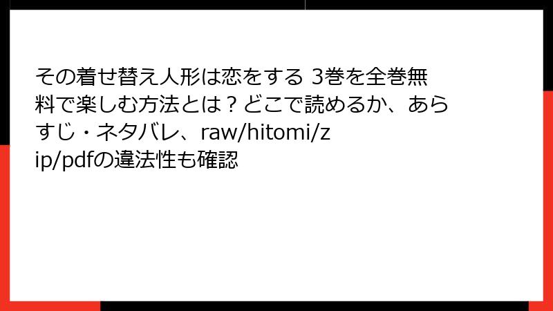 こんにちは、漫画大好きブロガーです! 今日のトピックは、ちょっとシリアスなもの。『その着せ替え人形は恋をする』のような魅力的な作品を、raw、hitomi、zip、pdf、漫画バンクなどの海賊版サイトで読むことのリスクについて、徹底的に掘り下げます。無料で最新話が手に入るのは魅力的ですが、その裏側には深刻な危険が潜んでいます。法的問題からサイバーセキュリティの脅威まで、実際の被害事例を交えながら解説。安全に楽しむためのヒントもお届けします。未読の方はここでブラウザを閉じて、正規ルートをおすすめしますよ! それでは、詳しく見ていきましょう。