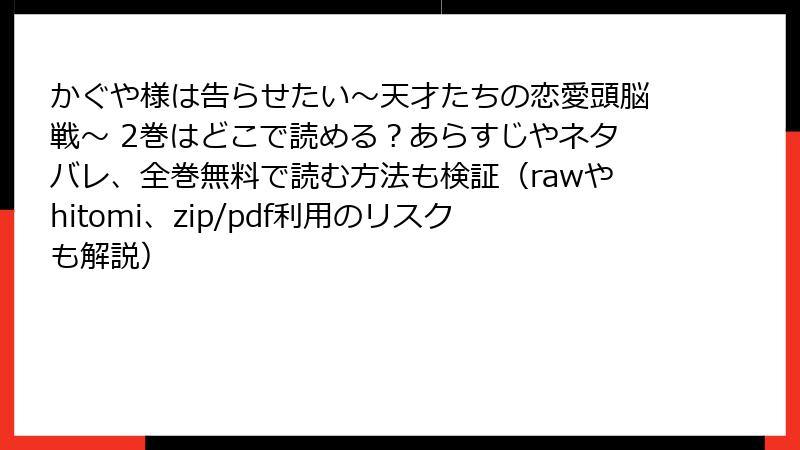 rawやhitomiなどの海賊版サイトは、法的罰則、ウイルス感染、金銭被害の三重苦。2025年の今、摘発強化とセキュリティ脅威の進化で、利用は自爆行為です。『かぐや様は告らせたい』の頭脳戦のように、賢く正規ルートを選んで! あなたのリサーチで気づいたリスクはありましたか? コメントでシェアを。次回は安全アプリレビュー予定。安全第一で漫画ライフを満喫しましょう!