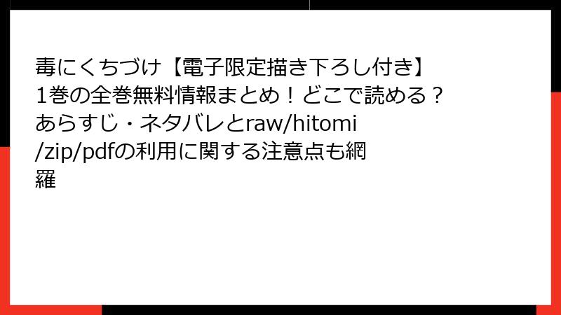 こんにちは、漫画愛好家のブロガーです! 人気BL作品『毒にくちづけ【電子限定描き下ろし付き】1巻』のような魅力的な一冊を、無料で手に入れたいと思う気持ちはわかります。でも、raw、hitomi、zip/pdfファイル、漫画バンク(やその後継サイト)などの海賊版サイトに頼るのは、2025年現在、想像以上のリスクを伴います。これらのサイトは一見便利に見えますが、法的罰則からデバイス破壊、倫理的後悔まで、利用者の人生を台無しにする落とし穴だらけ。今回は、そんな海賊版の闇を徹底的に掘り下げ、具体的な被害事例や回避策を交えながら解説します。未読の方も、読了後の皆さんも、ぜひ正規ルートを選んで安全に楽しんでくださいね。