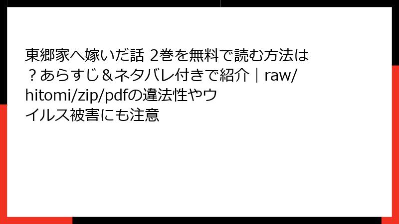 raw(生のスキャン版漫画を提供するサイト)、hitomi(主にアダルト寄りの画像共有プラットフォーム)、zip/pdf(圧縮ファイルでダウンロード可能な違法アーカイブ)、漫画バンク(閉鎖された有名リーチサイトの後継版)などは、著作権者の許可なく漫画を無断アップロード・配布する違法プラットフォームの代表格です。Google検索で簡単にヒットし、『東郷家へ嫁いだ話』のような最新エピソードも即閲覧可能に見えますが、運営者は国外サーバーを利用して取り締まりを逃れ、広告収入やユーザー データ収集で利益を上げています。