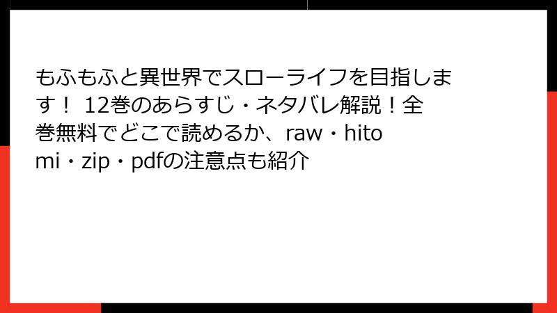 海賊版サイトの利用は、法的トラブル、デバイスへのダメージ、クリエイターへの不義理、そして作品体験の低下を招く危険な選択です。『もふもふと異世界でスローライフを目指します!』の癒しと感動を最大限に味わうためにも、正規の方法で楽しむことを強くおすすめします。皆さんはどうやってこの作品を応援していますか? コメントで教えてください! 次は、13巻の予想を一緒に考えてみましょう!