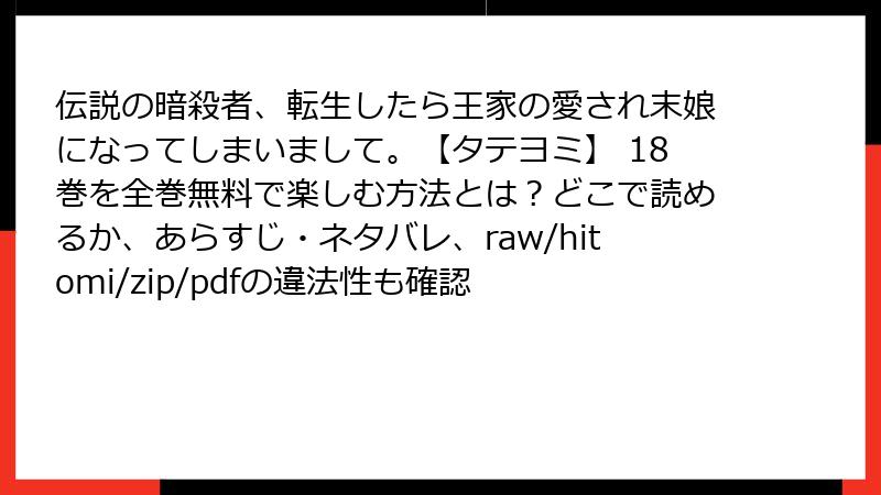 こんにちは、電子書籍大好きブロガーです! ジャンプTOONで爆発的人気の異世界転生ファンタジー『伝説の暗殺者、転生したら王家の愛され末娘になってしまいまして。【タテヨミ】』。伝説の暗殺者トートが愛され王女リシアとして王宮でドタバタするこの作品、18巻まで出てるのにまだまだ続きが気になりますよね。電子書籍版はジャンプコミックスDIGITALレーベルで配信中ですが、指定のサービス(コミックシーモア、BookLive、まんが王国、ebookjapan、Renta!、めちゃコミック、ピッコマ、LINEマンガ)でどこまで読めるのか、2025年10月5日時点の最新情報を基に詳しく解説します。無料試し読みの有無やコスパも触れつつ、ブログ風に読みやすくまとめました。ジャンプ作品なので配信範囲は広めですが、意外と穴場サービスもあるんですよ!