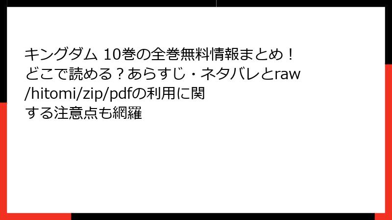 raw、hitomi、zip、pdf、漫画バンクなどの海賊版サイトは、法的・セキュリティ・品質・社会的なリスクの塊。無料の代償はあまりに高く、2025年の今こそ避けるべきです。代わりに、電子書籍サービス(例: 無料試し読みやキャンペーン豊富なプラットフォーム)を利用すれば、安全に高品質で楽しめます。『キングダム』を合法的に読むことで、作者を応援しつつ、心置きなく没入できるはず!